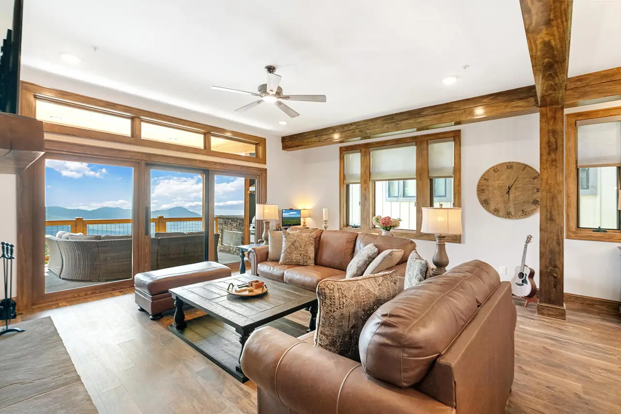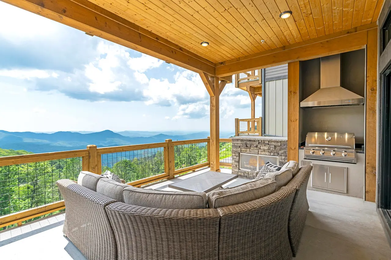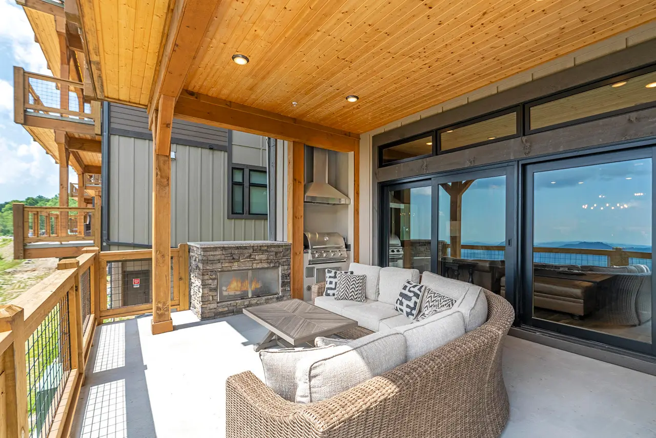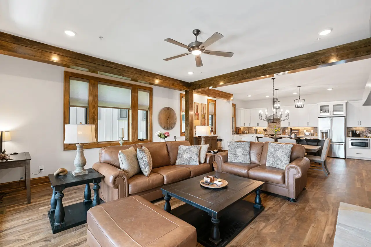 Each three-bedroom unit includes ADA-compliant site elements, accessible entries, and optional layout plans that allow customization during construction. Timber framing and stone accents carry from exterior to interior, reinforcing a strong connection to the surrounding mountainsides overlooking Grandfather Mountain. The design reflects both the setting and the evolving needs of modern mountain living.