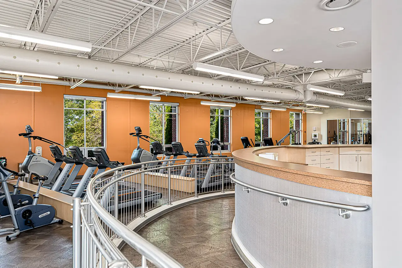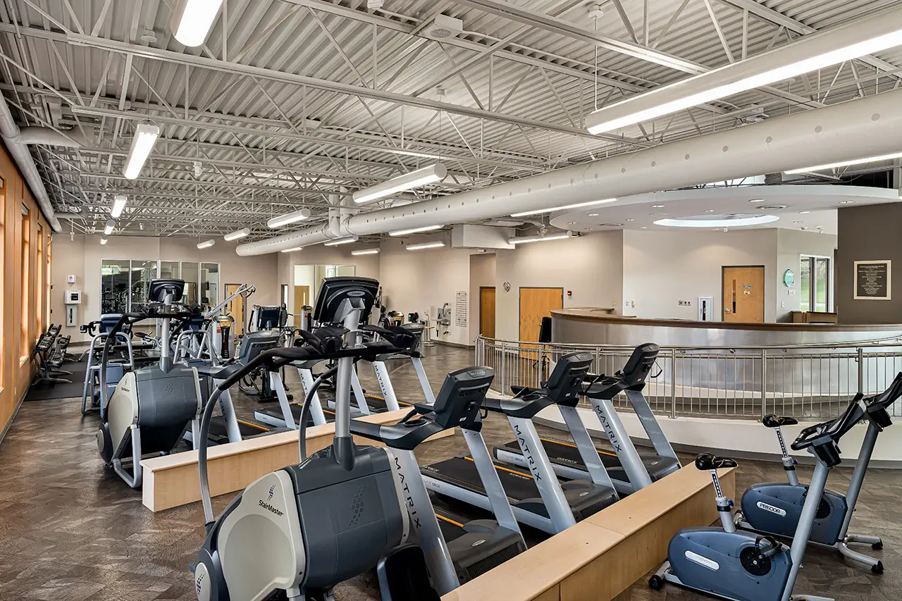 The facility includes exercise rooms, aerobics and spinning studios, a nurse station, ADA-compliant restrooms, offices, and a student lounge. Sustainable strategies emphasize natural daylight, energy-efficient plumbing and fixtures, and dedicated recycling spaces. The project was recognized by the Associated General Contractors as Project of the Year and received multiple awards for excellence and sustainability.