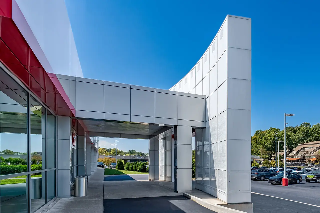 The project included partial renovation and demolition of the existing structure, along with significant new construction. ACM panels and glass storefronts deliver a sleek, contemporary showroom aesthetic. The work was completed in two phases, allowing the dealership to remain operational throughout construction. Services spanned from pre-design through construction administration, including 3D renderings to support client decision-making.